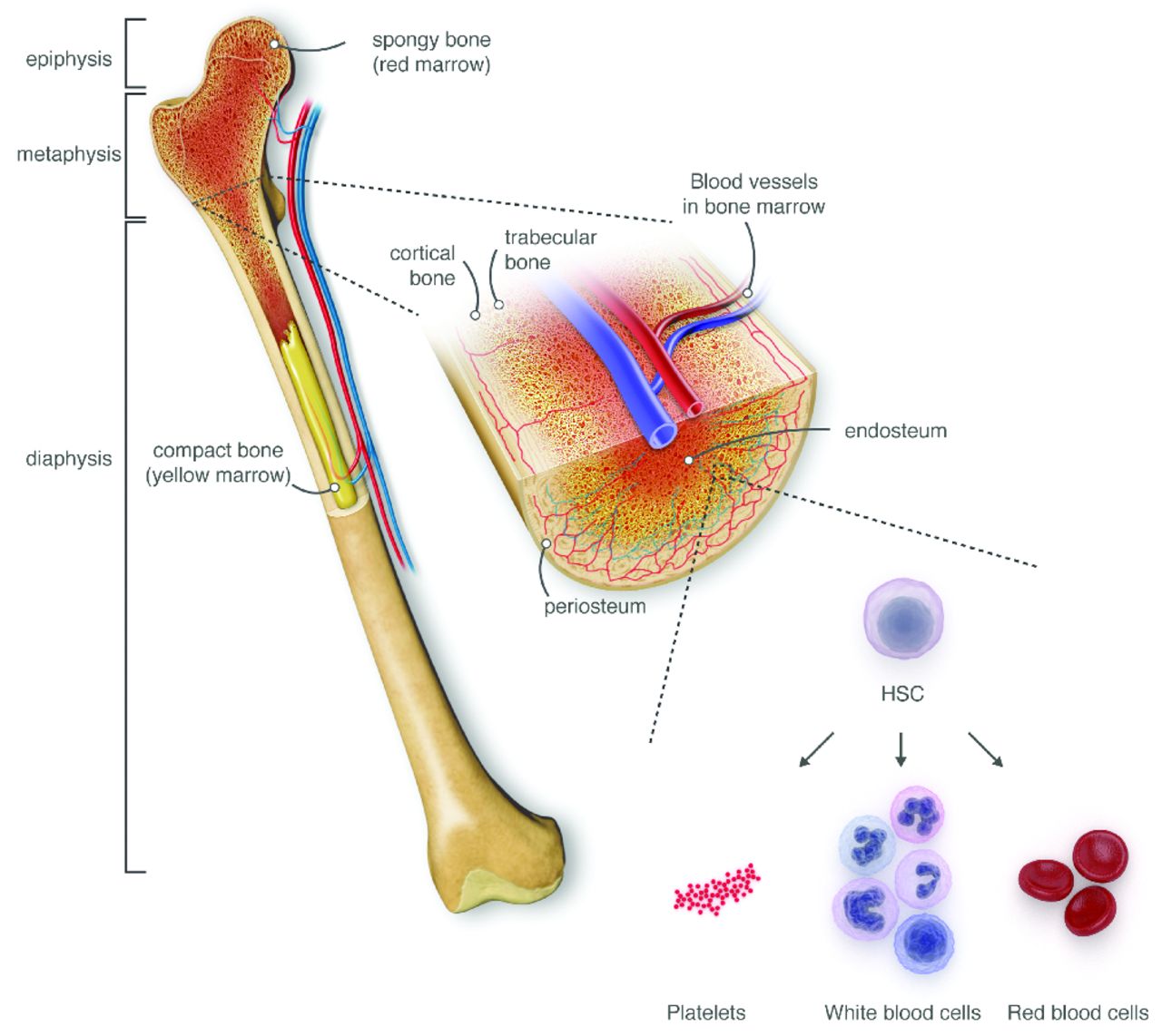 Illustration of bone marrow. Top diagram shows red bone marrow Stock Photo - Alamy from c8.alamy.com Bone marrow is the soft, flexible, vascular tissue found in the hollow interior cavities and cancellous bone spaces in the center of many bones and which is the source of erythrocytes (red blood cells) and leukocytes (white blood cells). Red marrow is found mainly in the flat bones such as hip bone, breast bone, skull, ribs, vertebrae and shoulder blades, and in the cancellous (spongy) material pink marrow is found in the hollow interior of the middle portion of long bones. Long bone label the structure the long skeletal system sign. Here we map the transcriptional landscape of mouse bone marrow vascular, perivascular and osteoblast cell populations at. Learning outcomes at the end of this course you will be able to: • may also be used for quantitative evaluation, especially if the biopsy is suboptimal. Yellow bone marrow is located in the hollow cavity of long bones. The yellow bone marrow consist of fats.